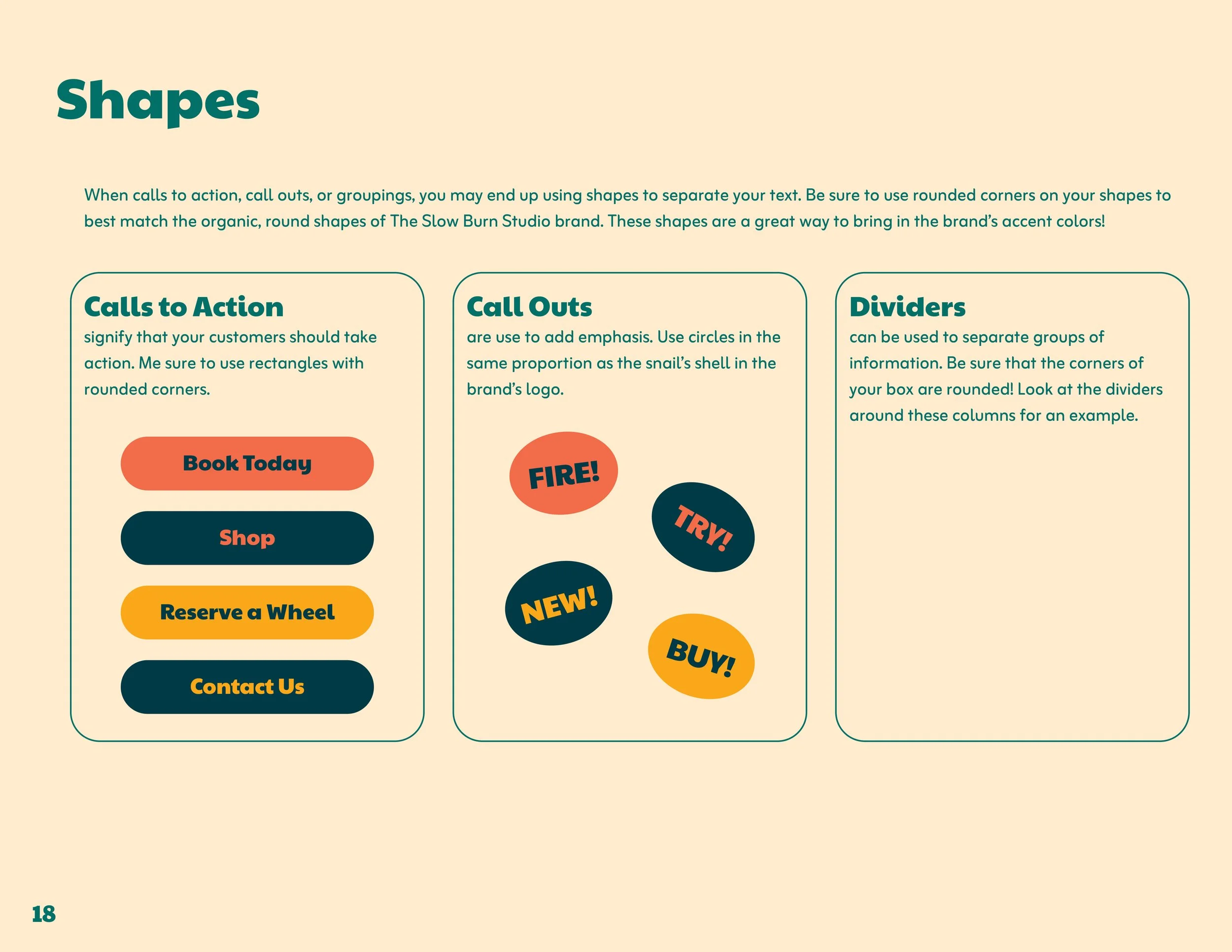 The secondary color palette can come into play here for call outs or calls to action. When possible, the shape of these call outs should stay within proportion to the “O” shape from the logo.