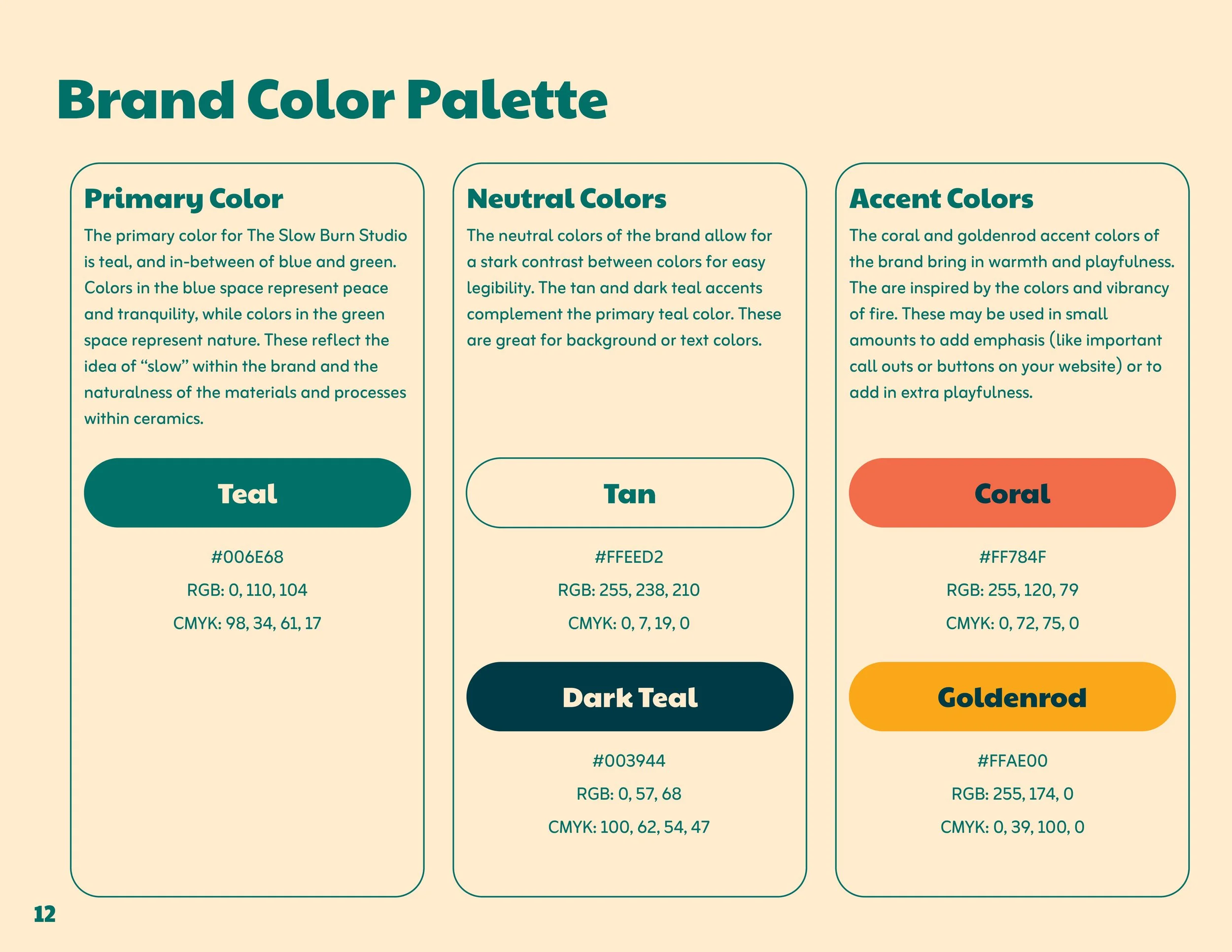 The primary color of teal and complementing neutral tones complement the idea of slowness. The promote peace, ease, and calm. The teal color still maintains a brighter tone, keeping the mood uplifting and happy.